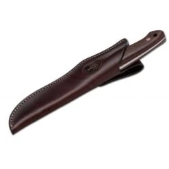 A handy and exceedingly rugged hunting and outdoor knife. The pronounced choil on the 4.6 mm thick satin finished blade ensures exceptional handling characteristics. The beautifully made stainless steel bolster gives the Trapper harmonious and highly appealing lines. Handle scales made from Guayacan ebony with red fibre liners. Bohler N695 blade steel with lanyard hole. Supplied with brown leather pressure fit sheath.
