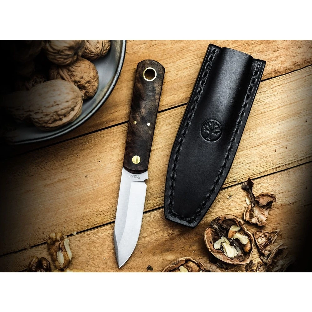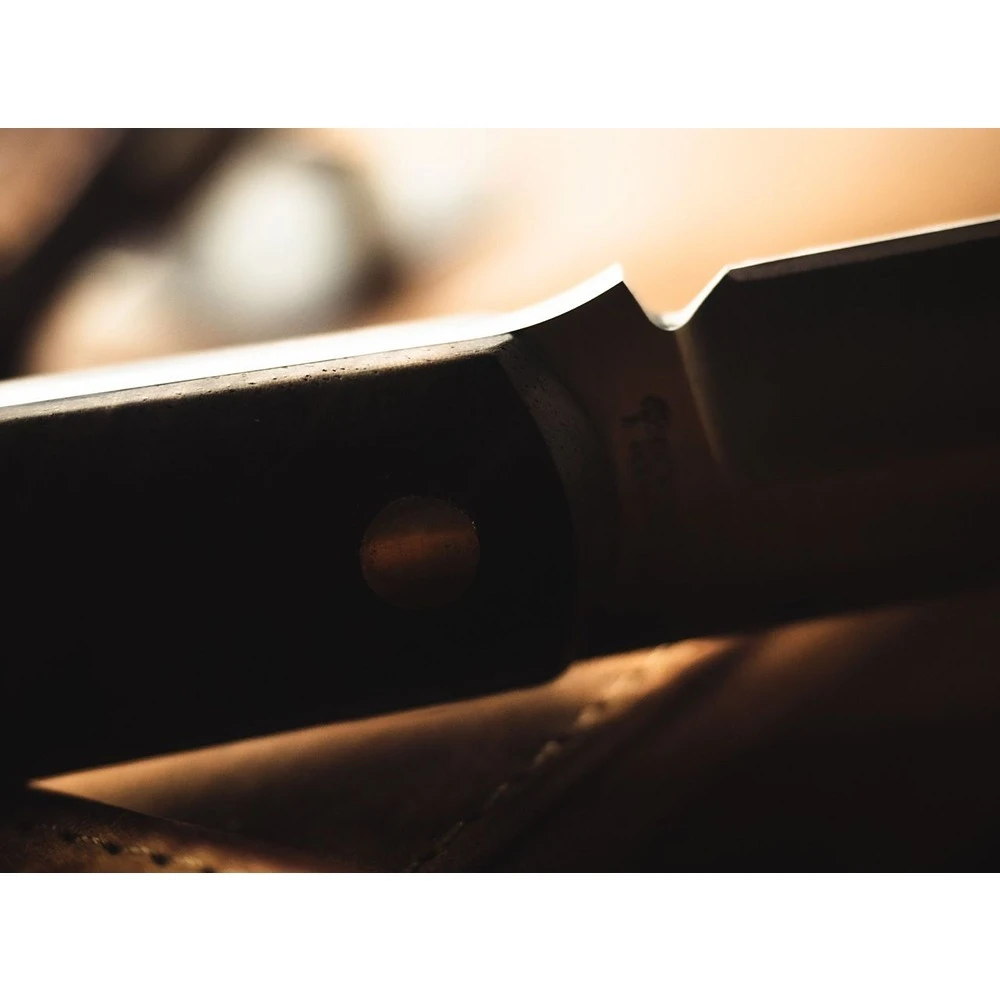 In this fixed version, tradition, everyday utility and a touch of tactical finesse find a harmonious harmony. The compact Barlow BFF is made of ice-hardened AEB-L, a versatile blade steel with excellent cutting capabilities, good rust resistance and easy resharpening. Designed as a fixed blade, this version of the timeless classic is equipped with contoured handle scales made of local walnut wood and fits comfortably in the hand. The decorative hollow brass stud also serves as a lanyard hole and, together with the studs in the same colour, adds a visual accent. Supplied with a custom fit black leather sheath with an integrated clip ensuring a high level of carrying comfort. Handmade in the Boker Knife Manufactory in Solingen.