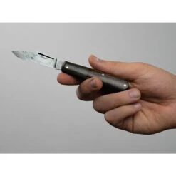 The pocket knife with its integral construction is equipped with a contoured handle body made of olive green Canvas Micarta, which is milled from the solid and also forms the characteristic bolsters of the Barlow. The lightweight construction can thus completely dispense with additional metal liners. Thanks to the likewise contoured handle scales made of certified imported desert ironwood, this noble gentleman’s knife is extremely comfortable to hold. With high-quality felt case for storage, certificate of authenticity and individual serial number. Handmade in the Boker Knife Manufactory in Solingen.