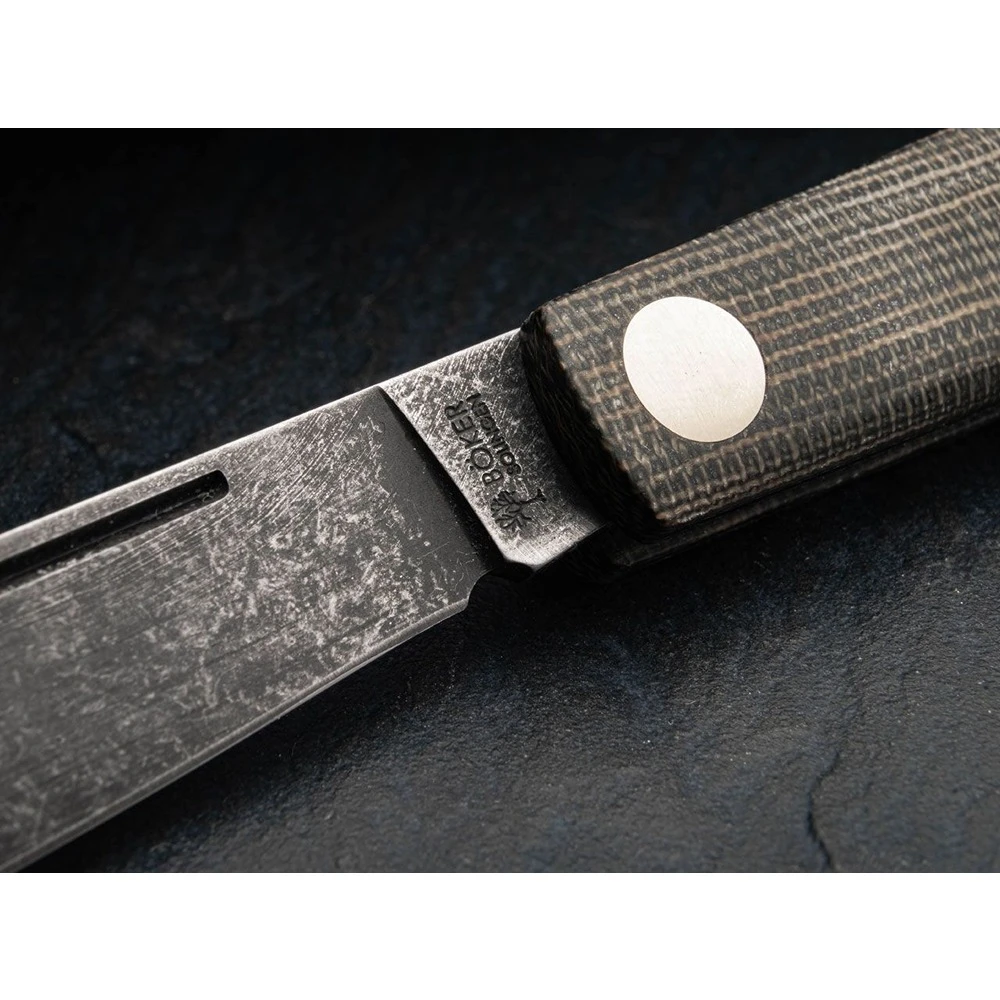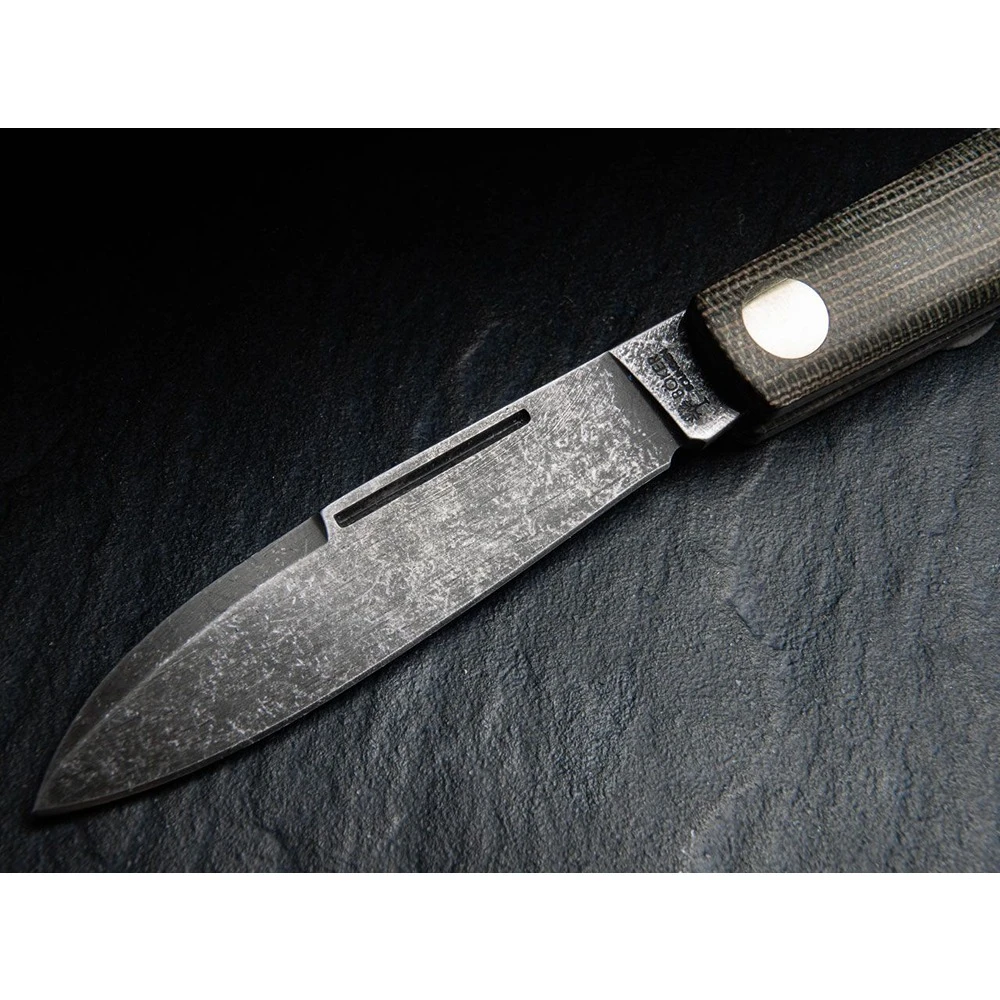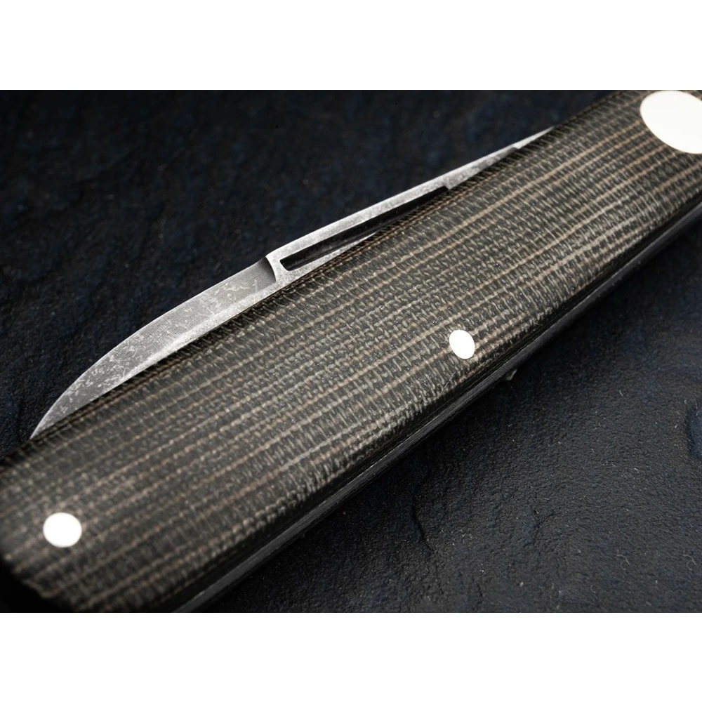 This integrally constructed version of the newly interpreted Boker Barlow Prime goes without the characteristic bolsters and is instead equipped with continuous, pleasantly contoured handle scales made of dark green Canvas Micarta. The lightweight construction can thus completely dispense with additional metal liners. The blade is made of O1 non-stainless carbon steel and has a special acid-wash finish. It is equipped with a modern, elongated ricasso and is opened by nail nick. The operating safety of the slipjoint pocket knife is increased by a 90 degree arrestor when opening and closing. The decorative rivets are made of brass. With high-quality felt case for storage. Handmade in the Boker Knife Manufactory in Solingen.