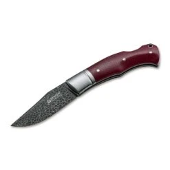 The Boker Boxer, designed by Raphaël Durand from Thiers, is a classic two-handed knife that is extremely popular. In this particularly noble version, the traditional pocket knife is equipped with a dark blade of Dragonskin damascus by Bertie Rietveld, which is hardened to 58 HRC. The South African custom knifemaker is considered the country’s first damascus smith and has been forging high-performance damascus with unusual patterns since 1991. The blade is locked by a sturdy backlock and has a generous ricasso. The decorative stainless steel bolsters bear the groove typical of Raphaël Durand. The handle scales are made of polished red burlap micarta and are very comfortable to hold. The handy size is the perfect compromise between pocket suitability and versatility in use. With reinforced lanyard hole. Handmade in the Boker knife manufactory Solingen. Delivery with individual serial number in a noble floating display with certificate of authenticity.