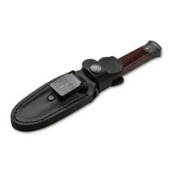 The bolsters and end knob are made of steel and are finished with a dark stonewash finish. Supplied with a high quality black leather sheath with a sewn-in ulticlip and can be easily attached thanks to the locking spring clip. Thus the Boker P08-Damascus boot dagger can be pulled effortlessly while the sheath is reliably held in place by the Ulticlip. Handmade in the Boker Knife Manufactory in Solingen. With noble floating display, certificate of authenticity and individual serial number.
