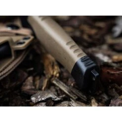 Trimmed for the outdoors – made for adventure. The Boker Plus Desertman contains the uncompromising DNA of the successful Outdoorsman and convinces as a full blown fixed blade knife on every trip into the outdoors. The continuous tang and the wide blade ensure maximum stability, while the protruding handle end shaped as a hammer surface provides valuable services. The directly injected GRP handle has a large grip zone made of sandy brown TPR, which guarantees secure, pleasant handling even in wet or cold conditions. The spearpoint blade is made of 12C27 and is titanium coated for increased corrosion protection. Supplied with a custom fit plastic sheath.