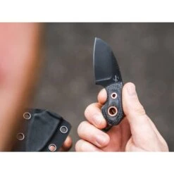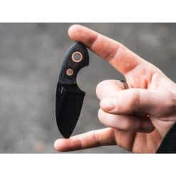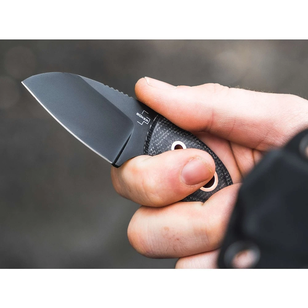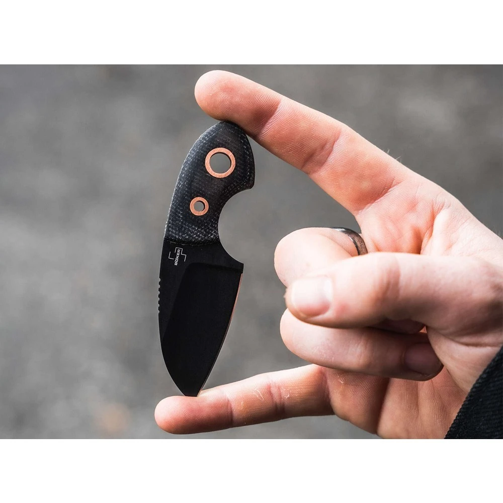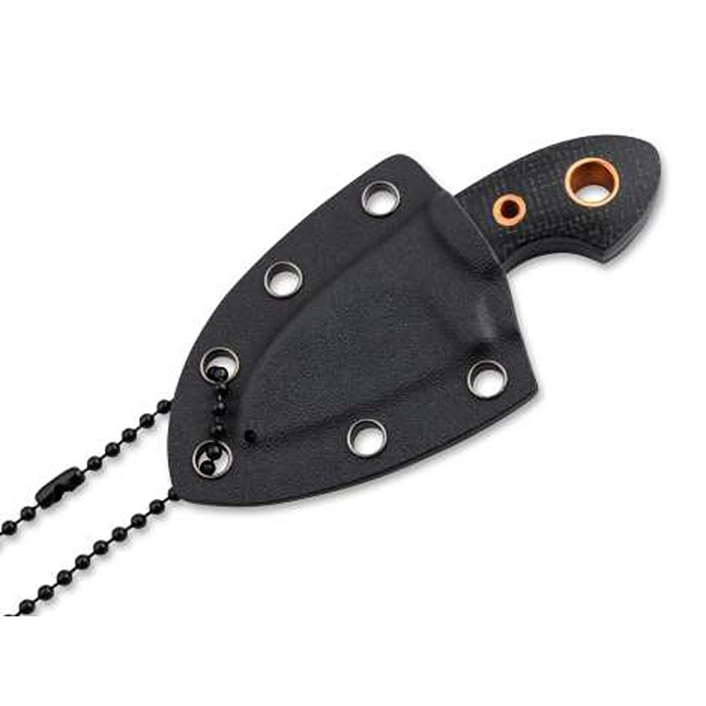 The entirely black Boker Plus Gnome by Jesper Voxaes inspires with its ultimate compactness, which is precisely why it ensures outstanding carrying comfort. The titan-coated blade is made of edge-retaining D2, so that the little powerhouse easily masters everyday cutting tasks. The Micarta handle scales feature two hollow copper studs, the rear of which can be used as a lanyard hole. The ergonomics of the handle guarantee an excellent grip and make the knife not only a pleasure to hold, but also a useful companion. The custom-fit Kydex sheath is equipped with a ball chain that underlines the claim of the Boker Plus Gnome as a neck knife.