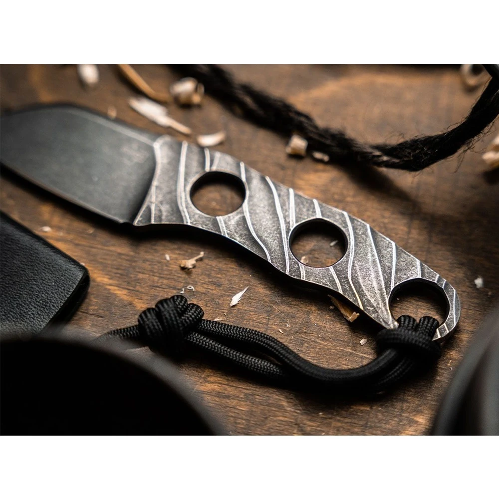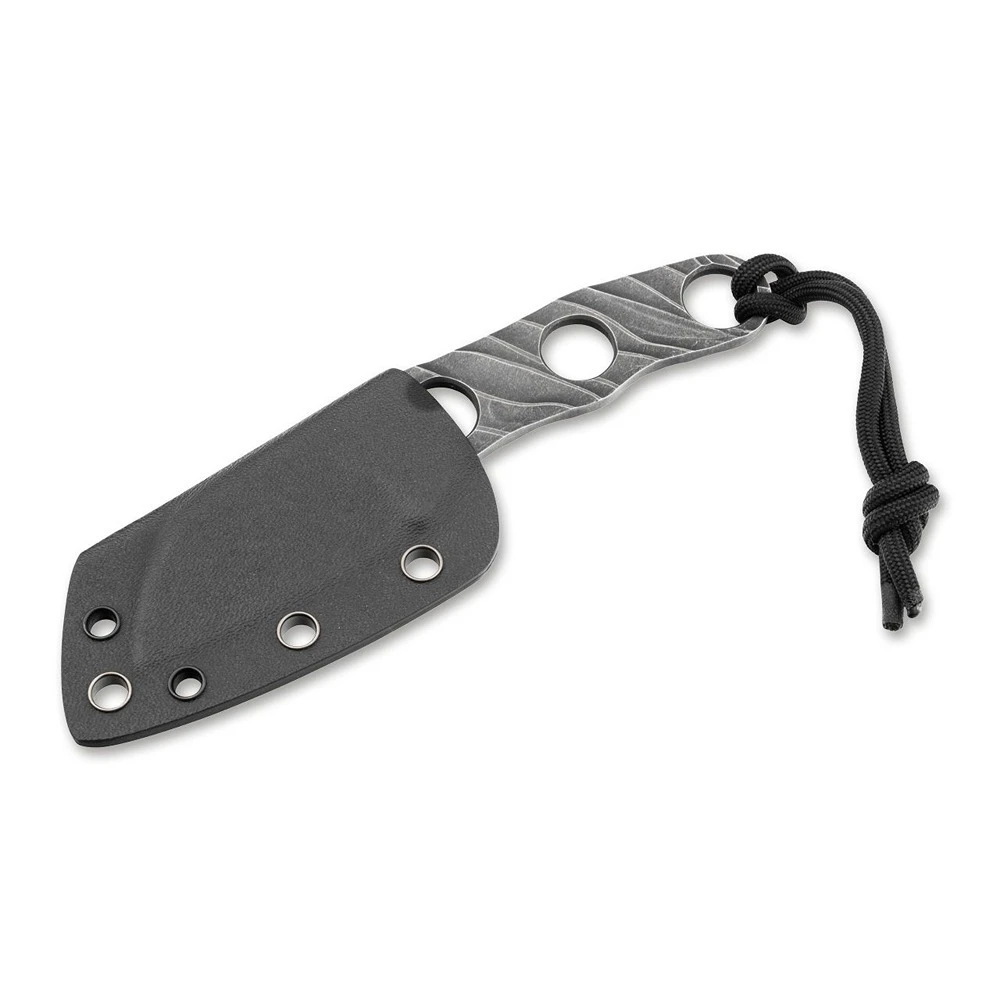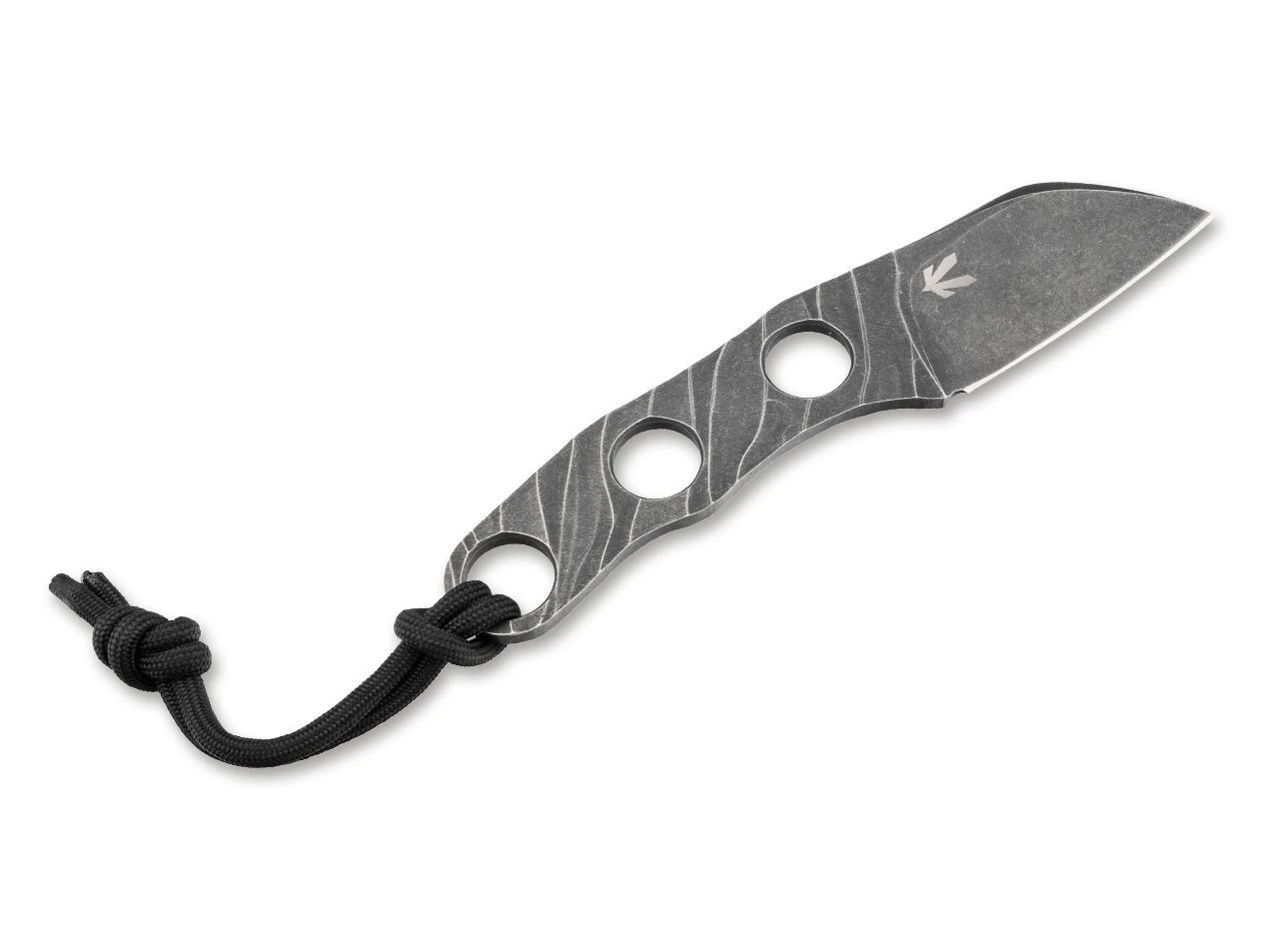 The Boker Plus Kazhan designed by Alexander Krava is a handy neck knife with a short sheepfoot blade that is ideal as a backup knife for everyday use due to its light weight. The young knifemaker from Lviv, Ukraine, places particular emphasis on the aesthetics of his designs, which are convincing not only as reliable tools but also as high quality accessories. The skeletonised Kazhan is made of D2 with a dark stonewash finish. Weight-reducing cut-outs and three dimensional milling give the knife a very special look. Supplied with a lanyard, ball chain and a custom-fit Kydex sheath.