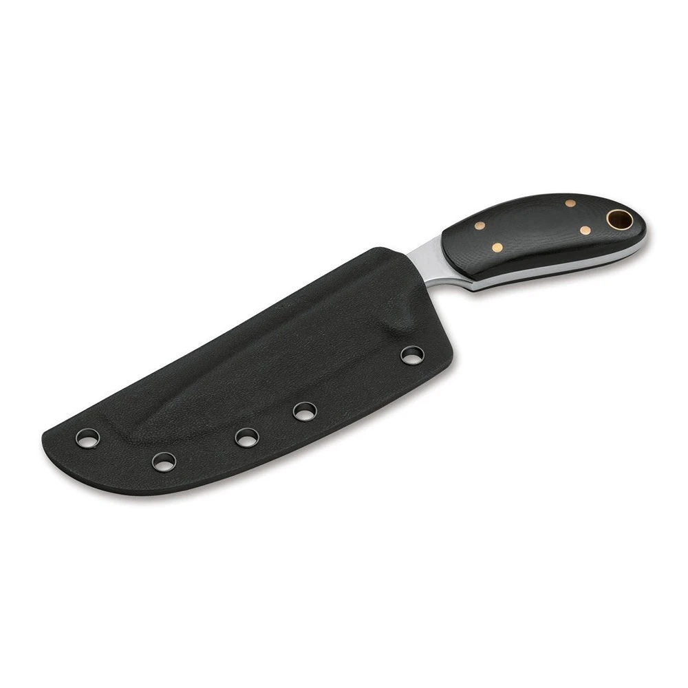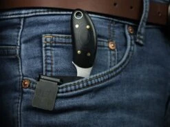 Custom knifemaker Mickey Yurco is no stranger to our customers. His unerring sense for ergonomics and unconventional solutions is fully brought to bear in the design of the fixed-blade Boker Plus Pocket Knife. The short handle offers an exceptionally comfortable and secure grip. Considering how the knife is supposed to be carried (clipped inside a trouser pocket), the short construction is a major advantage. This pocketknife can be worn just as comfortably discreetly as a folder. This model is the first to use the Ulticlip – with a secure spring clasp that can be attached to the pocket seam – which makes the knife easy to pull out, while the Kydex sheath is held securely in place by the Ulticlip. Users seeking to combine the benefits of a folder with those of a fixed-blade knife may find the Pocket Knife to be their perfect new companion.