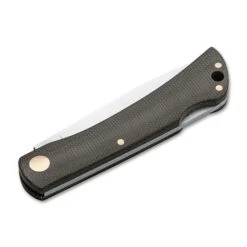 The Rangebuster is a traditional pocket knife that was developed in the USA for use in agriculture as early as the 18th century. The light and comparatively simple knife is reminiscent of the Solingen Hippekniep, but here it is equipped with a reliable backlock. The satin-finished Droppoint blade of ice-hardened N690 with 60 to 61 HRC is flat-ground and is opened with the help of the traditionally serrated nail nick. The handle material is olive green Canvas Micarta, the decorative rivets are made of brass. Thanks to the contoured handles and the slim, lightweight construction, the Böker Rangebuster is extremely comfortable in the hand and thus creates the transformation from a working knife to a gentleman’s knife. Handmade in the Boker knife manufactory Solingen.