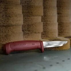 The ergonomic barrel-shaped polymer handle features a friction grip, sturdy finger guard, and a 2.0 mm thick blade made of carbon steel, which provides both strength and stability in every cut. Thanks to the blade and handle design, this knife is ideal for working safely and efficiently in differing weather conditions all year round. The polymer sheath is equipped with the Morakniv Smart Button System which means you can attach several craft knives for different purposes to each other. It also has a practical belt clip for easy attachment to your belt. Carbon steel rusts, so wipe and oil the blade after use.